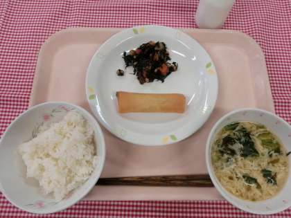 「五目豆」は、5品目の具材とともに大豆を煮てつくりました。ごはんにのせて食べてもひじきごはんのようになっておいしいですよ。