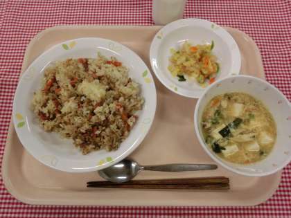 スープは、鶏ガラと野菜の皮などでだしをとって作ったコーンスープです。温かいスープで体の中から温まりましょう。