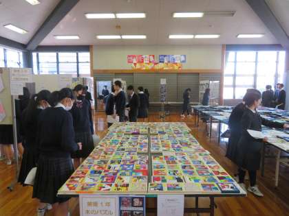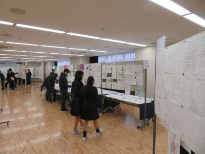 展示発表会を見学する生徒の様子です。昨日は2年生、本日は1年生と3年生が見学になります。