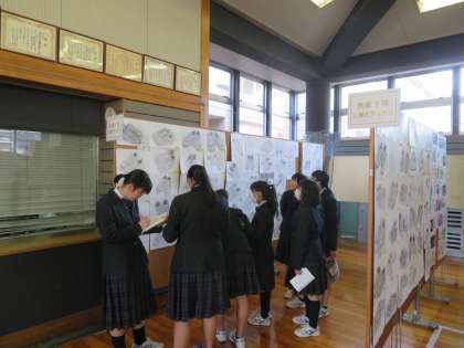 自分たちの学年の作品だけでなく、他学年の作品も興味をもって鑑賞していました。生徒たちは見学の感想を鑑賞カードに1つ1つ丁寧に書いています。