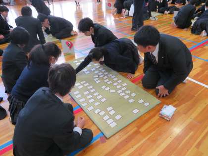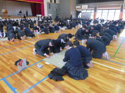 百人一首大会の1回戦が始まりました。今日まで国語の時間だけでなく、昼休みなどどのクラスも練習を重ねた成果が出ています。どのクラスも頑張ってください。(田村)