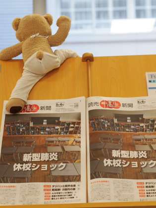 NIEコーナーの新聞閲覧台にいるきー坊が背中を見せています。きっと、休校でみんなが立ち寄ってくれないので、さびしがっているのかもしれません。今日発行の中高生新聞には新型肺炎に関連して、中高生からの疑問に答える記事が掲載されています。もし、学校に荷物を取りに来たりすることがあったら立ち寄って読んでみてください。何となく不安、という時には正しい知識を持つことが大切です。