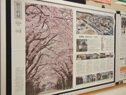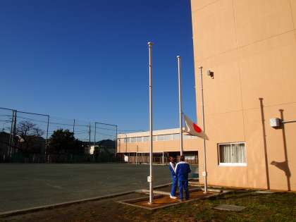 今朝のフナキボの校庭は、雨もあがり澄み渡る青空がひろがっています。そんな中、主事さんが校庭のボールに半旗を掲げる準備をしています。今日は、3月11日。東日本大震災から9年がたちました。