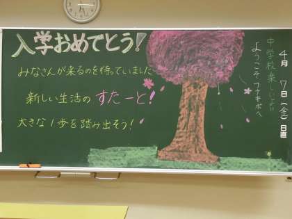 明日は8期生の登校日。3年間の中で、卒業式前の最後の登校日です。最後はあっと言う間に迎える卒業式になりましたが、楽しい思い出は決して消えることはありません。中学校生活をこのホームページで振り返ってみましょう。まずは、3年前の入学式です。ドキドキ緊張の入学式でしたが、教室に入ると7期生のメッセージが優しく迎えてくれました。このアート覚えていますか。んっ?まさか、自分が何組だったか、忘れた人はいないでしょうね。