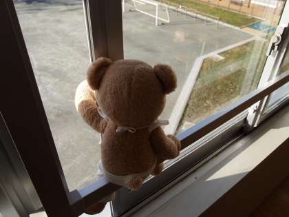 3階の教室からきー坊がながめている景色は、きっと今頃フナキボ生たちが「もうすぐこの学年、クラスが終わるんだな〜。長かったような、短かったような…」と思いながら眺めるはずだったもの。みんなの気持ちをきー坊も感じているようで、後ろ姿に寂しさが。。。