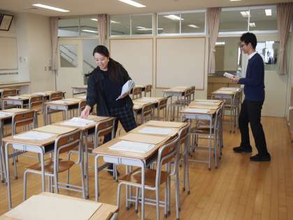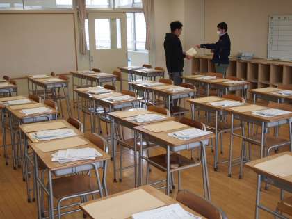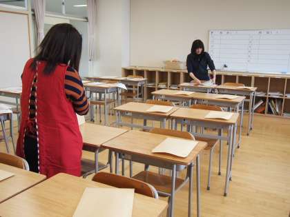 いつもならば「はい、これを後ろに配って」と列ごとに回していくのですが、明日は時間差でしかもなるべく早く終わらせるため、先生がペアになって配布物をまとめる作業中です。