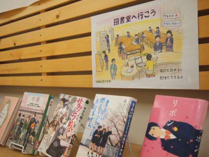 校内を歩くと、図書室前にも新学期を迎えるフナキボ生のために、たくさんのお薦め本が用意されています。この本を手に取る日が早くくることを、図書室の司書さんも願っています。