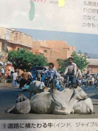 社会科(地理)クイズの第二問です。今回も資料集からの出題です。写真にあるのはインドの街の様子です。道路の真ん中に牛が横たわっています。でも周囲の人は驚く様子もありません。これは一体なぜでしょう?※答えは明日(石塚)