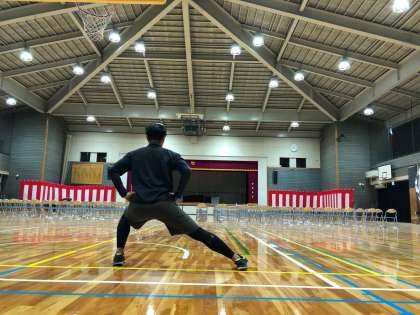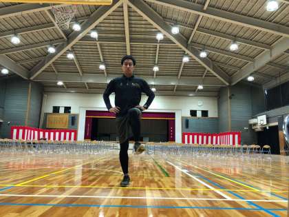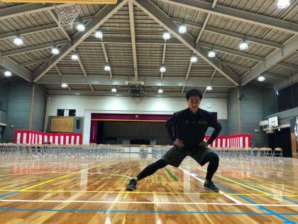 【2】横に大きく踏み出し、重心を下げます。この時、上体が前傾しないように注意し、お尻が伸びているか確認しましょう。横に踏み出した足で床を押して、もも上げの状態に戻り、そこから足をそろえて真っ直ぐ立つ姿勢に戻ります。