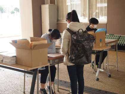 9時前から11期生がやってきました。就学通知書に緊急連絡先を書いてもらい、教科書類を受け取ります。さすがフナキボの1年生。ちゃんと、自分たちから「おはようございます」の挨拶をする生徒が多い!