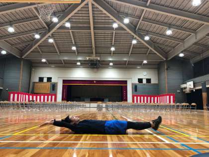 【1】仰向けに寝て、両手足を真っ直ぐに伸ばします。腕はひじを曲げずにバンザイの形です。この時、両手足が床につかないように注意しましょう。
