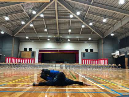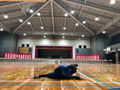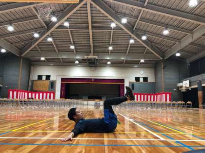 【2】【3】頭側から見た写真です。上半身を固定し、体幹を意識しながら左右交互にひねります。床に足がつかないように注意しましょう。【1】の姿勢に戻す時はゆっくり戻しましょう。