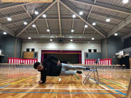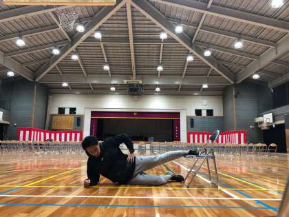 【1】ひじを立てて横向きの姿勢になります。もう片方の手は腰にあてます。上側の足を椅子に乗せ、下側の足はひざを曲げます。