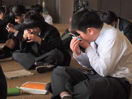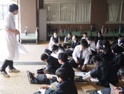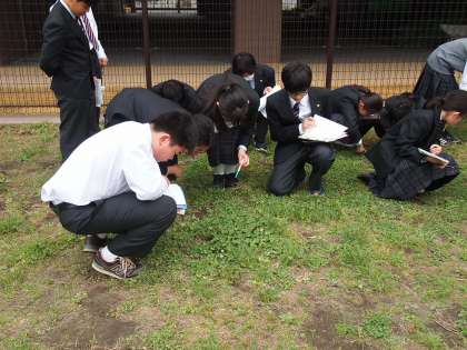 もちろん中学校の授業は教室だけでなく、このように校庭に出ることもあります。理科の授業で草花の観察をしている1年生(10期生)です。