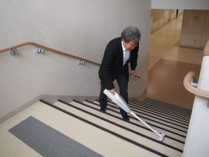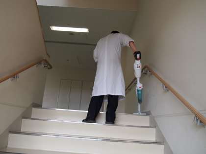 これは何?と新入生は思うことでしょう。登校時刻8時25分を過ぎると、各階の階段から一斉に「ウィーン」という音が。3人の先生が掃除機を掛けています。担任が学級活動をしている間、学年主任が掃除をするのは開校以来フナキボの伝統となっています。