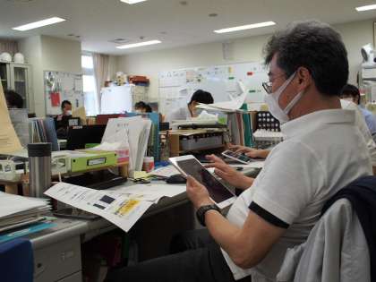 職員室ではベテランの先生も双方向学習型の方法を学んでいます。実際に始めるにあたっては課題も克服していかなければなりません。スマホでやってみた先生は「いや〜画面が小さすぎて厳しい〜」と声を上げています。今回の未知なる事態に対応するためには、新たなデジタルと従来のアナログの双方の特色を生かした対応をしていく必要があると感じました。