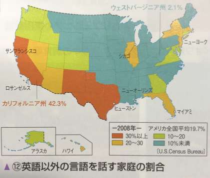 ?前回のクイズはこの地図からでした。この色が示すのは英語以外の言語を話す家庭の割合でした。アメリカ合衆国=英語と考えがちですが、実は多様な言語が使われているのです。特に多いのはスペイン語です。