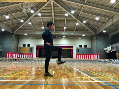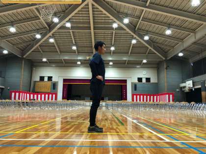 【1】両足をそろえて立ち、両手を腰に当てます。