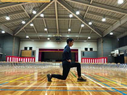 【3】ひざがくるぶしの上にくるように大きく足を踏み出します。深く沈み込んだ後、【1】の姿勢に戻します。