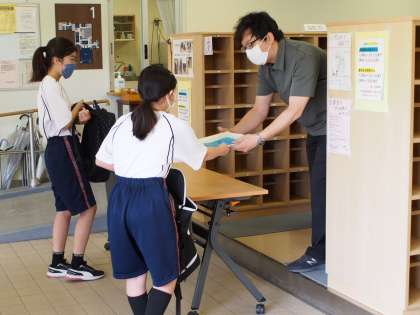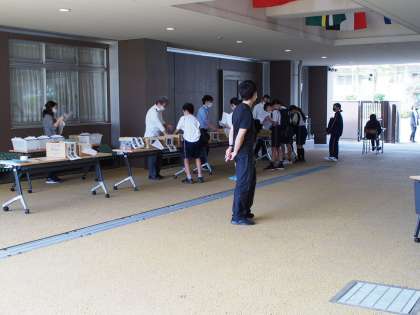 同じく課題をもらいに来た11期生。風通しのよいピロティーで課題を渡し、昇降口で新しい課題を受け取ります。そして新入生は、今日紙面でクラスを発表します。期待と不安が入り交じる新たな始まりです。ぜひ、学年だよりに書いてあることを読んで、全員が気持ちよくスタートできるようにしたいですね。