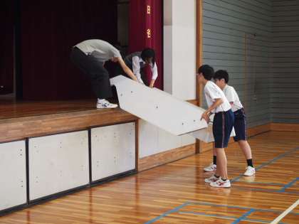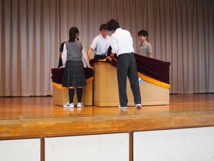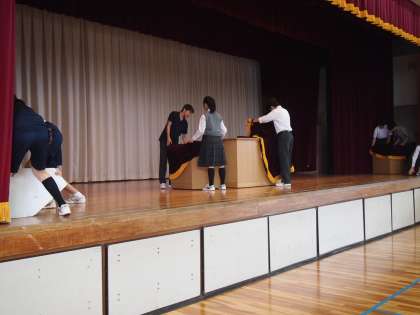 生徒会朝礼が終わって片づけをする生徒会役員の人たちです。次の授業時間に間に合わせようと黙々と、かつテキパキき動いています。でも決してイヤイヤ取り組んでいるわけではなく、もちろん笑顔も見られます。」こういうところも、フナキボだなあと感じる瞬間です。