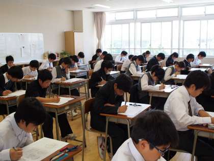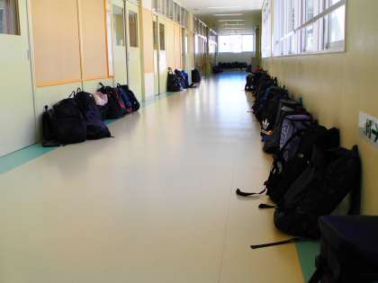 中間考査は毎年、ちょうど今頃行われます。試験中は机と机の間を開けるためにも、荷物は廊下へ。こう見ると何だか鞄やパックまで緊張しているように感じますね。
