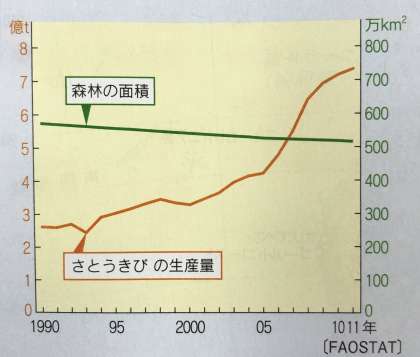 前回の問題はこのグラフからでした。このグラフのような変化をしている国は「ブラジル」でした。さとうきびの生産が盛んなブラジルでは自動車の燃料にさとうきびからつくったアルコール燃料が利用されています。この燃料は二酸化炭素の排出が少なく環境にやさしい燃料として注目されています。