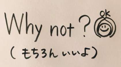☆「なぜダメなの」という意味が転じて「もちろんいいよ」という意味で使います。SureやOf courseと同じように使えます。