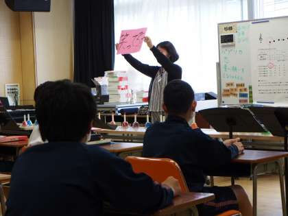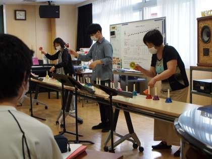 「遅れた学習を一刻も早く取り戻したい」と思う気持ちもあるとは思います。でも、今ここで焦ることは今後の長丁場を考えると心にも体にもマイナスになる。そう考えて、学校でしかできない授業をやることにしました。音楽は歌を歌うことも、吹く楽器の演奏もできません。そこでハンドベル。静かに、かつみんなでひとつの曲を作り上げるには最適なものです。まずは、先生3名が猛練習の成果を披露します。