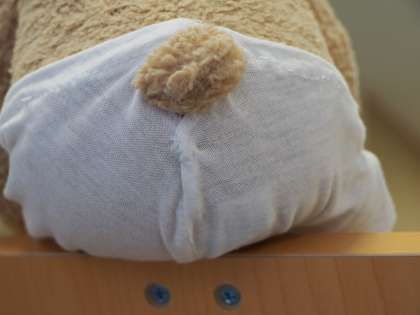 きー坊が何やら喜びのポーズをしています。それも、そのはず。フナキボのみんなから可愛がられすぎて、穴があいていたパンツを持ち帰って修理してくれた9期生がいます。そして、見事に修復!すっかりきれいになったパンツでご機嫌なきー坊です。