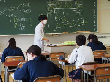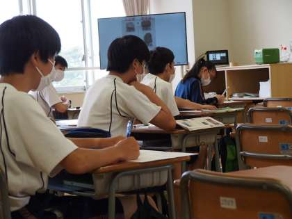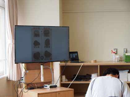 理科の授業ては、50インチのモニターに画像を映して火成岩について勉強中です。本来であれば「実物見本を触って」なのですが…。今はバーチャルで体験するしかありません。それでも、真剣な眼差しはやっぱりフナキボ生です。