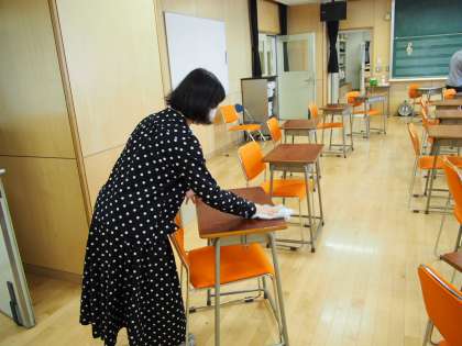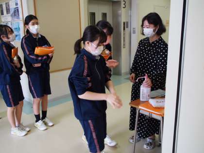 毎時間違うクラスが使用する音楽室は、そのたびに椅子や机を消毒します。大変な作業ですが、まさに感染症をこれ以上広げないための「気遣い」です。今日は10期生しか登校していませんが、各階の踊り場の窓を全開にすることで、風の通りをよくしています。