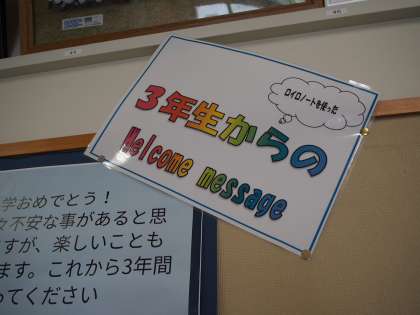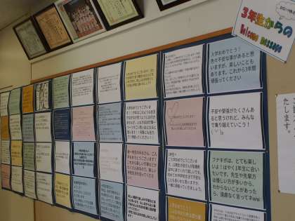 「期待よりも不安の方が大きいかもしれない」フナキボの3年生である9期生はちゃんと新入生の気持ちをくんで、ロイロノートを使いメッセージを贈っています。体育館に通じる2年生の昇降口前に貼ってあります。入学式当日は時間の余裕があまりないので、ぜひ来週の登校日に先輩からの伝言を見てくださいね。