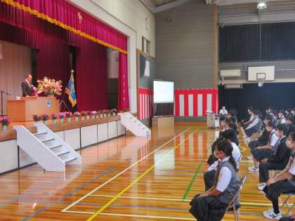 さて、最後になりますが、保護者の皆様、長きにわたりお待たせした入学式へのご臨席を心から感謝いたします。小学校六年間を大変な思いでお子さまの成長を支えてこられ、やっと卒業という矢先に休校になり、さぞやご苦労の連続だったと思います。思春期を迎える中学校で、お子さまがこれから人として成長していくためには、離れた所から見守ることも多々必要になります。この様な世の中で距離を置き見守ることはとても心配になるとは思いますが、心の距離だけは離さないようにすれば、三年後、本校を巣立つ際の自立したお子さまの姿を目にした時その感激はよりひとしおになることでしょう。ぜひ本校の教育活動にご協力いただき、十一期生の成長を、本日出席がかなわなかった地域の方とともに見守っていきたいと思います。