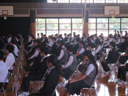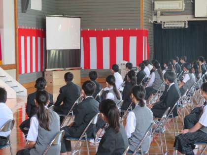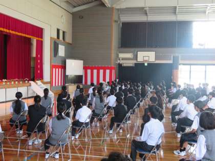 本年度は、校歌紹介という形で、新入生に校歌を披露しました。昨年度の合唱コンクールの映像を11期生も見ながら、先輩たちの立派な歌声を真剣に聴いています。(田村)