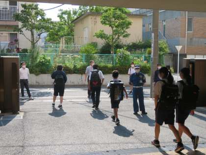 今週より2つの学年が同時に登下校を行いました。なるべく密にならないよう、教職員も配慮をさせていただきます。
