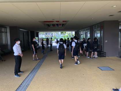 下校時は毎日全ての先生がピロティでお見送り。これがフナキボにあいさつが根付いてる秘訣!