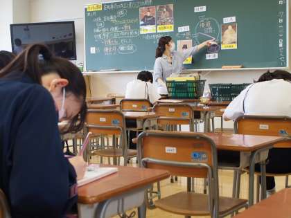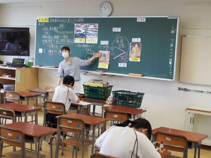 普段は50インチモニターに躍動感あふれる画像や動画を見せる2年生の社会科ですが、モニター機器の不具合があり、今日は室町幕府のなりたちを板書中心に学習中。それでも躍動感あふれています。生徒のノートもおのずと整理された内容が書けるようになりますね。
