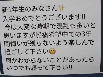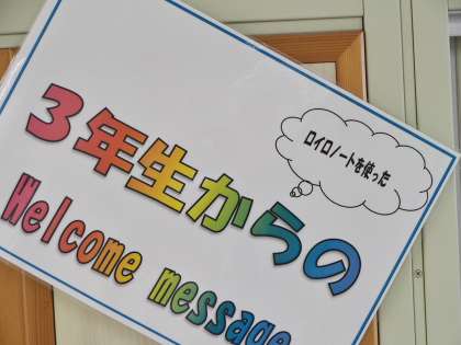 休校期間中、そして分散登校中にロイロノートの機能を使って9期生が新入生に向けて発信してくれたメッセージが11期生の廊下に貼ってあります。その一部を紹介しましょう。