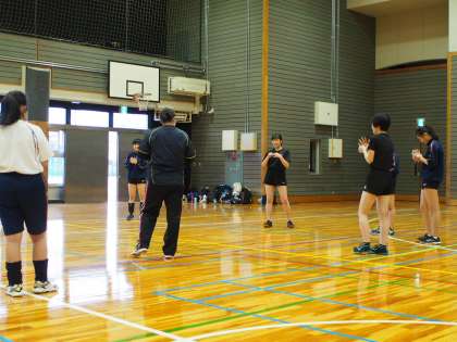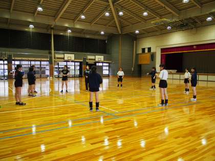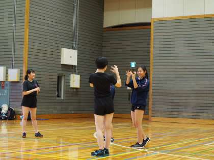 体育館ではバレーボール部が‘ゆび体操’から始めています。いつもならば2つの部活で使用する体育館ですが、最初は密を避けるために1つのみ。数ヶ月ぶりにボールを使うので、まずはけが防止が第一です。指を動かすだけでも楽しい!部員の表情が物語っていますね。