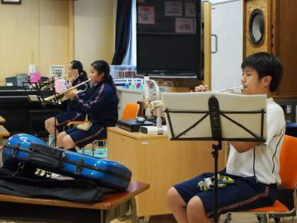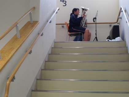 実は文化部の活動も飛沫感染防止対策には相当気を使います。今までパート練習は放課後の普通教室を使っていました。飛沫感染防止のために使えなくなり、北側校舎の廊下や階段の踊り場を使っています。音がお互い聞こえる範囲にいるため、相当苦労している様子が伝わってきます。