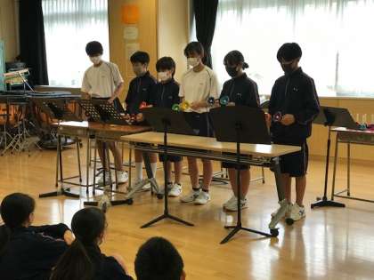 1年生の音楽の授業です。ハンドベル、音楽鑑賞、校歌の練習と、盛り沢山の内容ですが、みんな集中して取り組んでいます。校歌は、伴奏がないのでアカペラですが、頑張っています。(副校長)