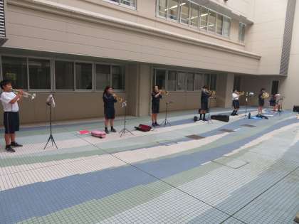 また、吹奏楽部は中庭を活用し、それぞれのパートごとに密にならないように練習を頑張っています。