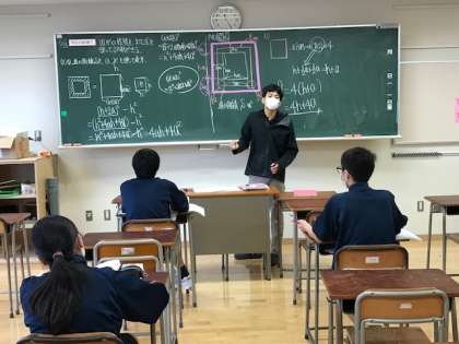 3年生の数学の授業です。図形の性質を文字式を使って説明できることをめあてに学習しています。注意深く図形を見て、計算で必要となる長さを見つけます。みんなよく取り組んでいます。(副校長)