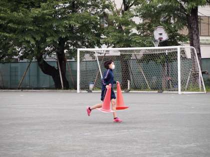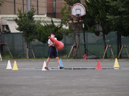 昼休み開始5分前。まだ新委員会がスタートしていないため、昼休みの校庭、ボール貸出業務は9期生の元体育委員会が担当。雨上がりの校庭の水たまりを回避させるためのコーンも走りながら設置します。えらいなあ〜。そしてちゃんと片づけも…あれ、一番下の走る画像はお手伝いをしている先生でした!