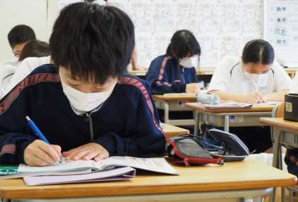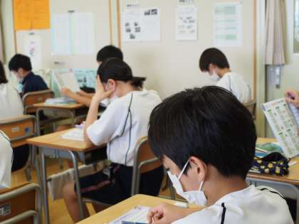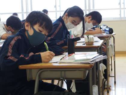 私が中学校の頃は「bag」は「バァッグ」と10回口で言って、10回書いてひたすら覚える、という勉強法が一般的でした。今日の授業では「b・a・g」を「ブ・ア・グ」と分けて音にし、それをくっつけながら早く発音するというもの。ん〜、なるほど。生徒はマスクの下で小さい声で発音しながらノートに単語を書いています。