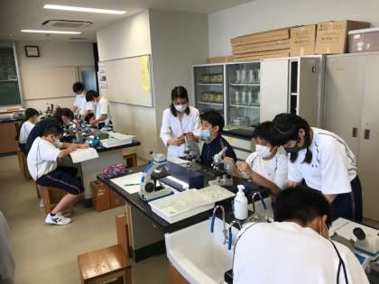 1年生の理科の授業です。顕微鏡の使い方と水中の微生物の観察を行っています。池の水などが入った水槽からスポイトで水をとり、顕微鏡でどんな生物がいるかを実際に見て学習します。顕微鏡の使い方にはいろいろと注意が必要なので、気をつけて扱っています。(副校長)