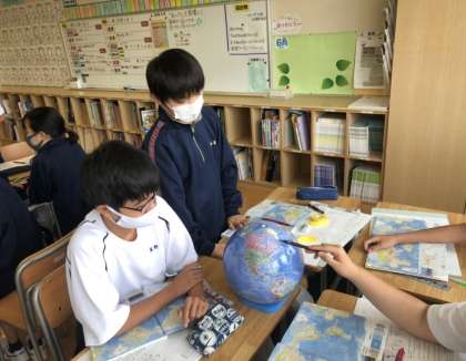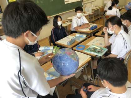今日の地理の学習では世界地図の歪みについて学びました。世界地図を見たとき、生徒たちはアフリカはグリーンランドの2倍くらいと予想しましたか、地球儀で確認すると…