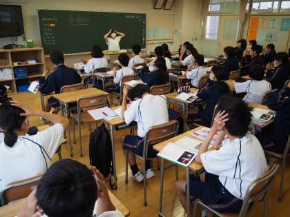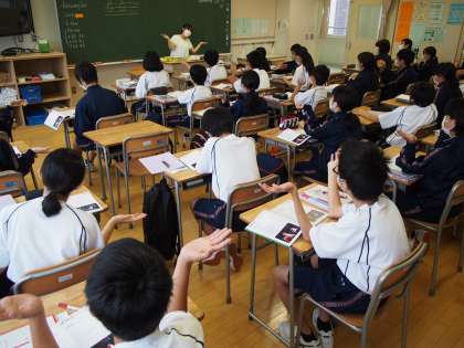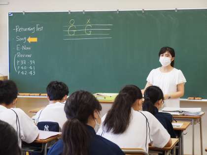 11期生の英語は、いつもの通り授業の進行のめやすを黒板の左側に示してあります。そして「song」ですが、これは今の世の中の状況ではまだできません。そこで歌の代わりにふりつけで表現する。えらいなあ、みんな。恥ずかしがらずに、やれるところがフナキボ生。