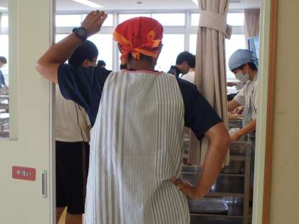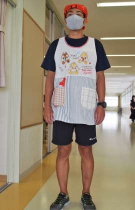 そして校庭ですっかり日焼けしている体育の先生のエプロン姿です。たくましい後ろ姿からは想像できない、胸のところにいる3匹のかわいいキャラクターの動物がポイントです。